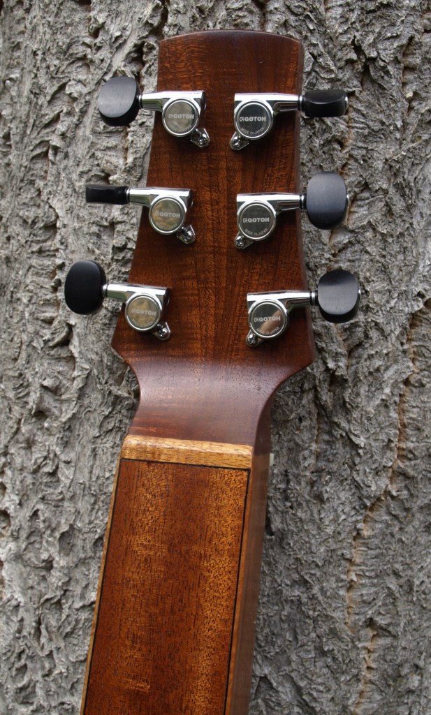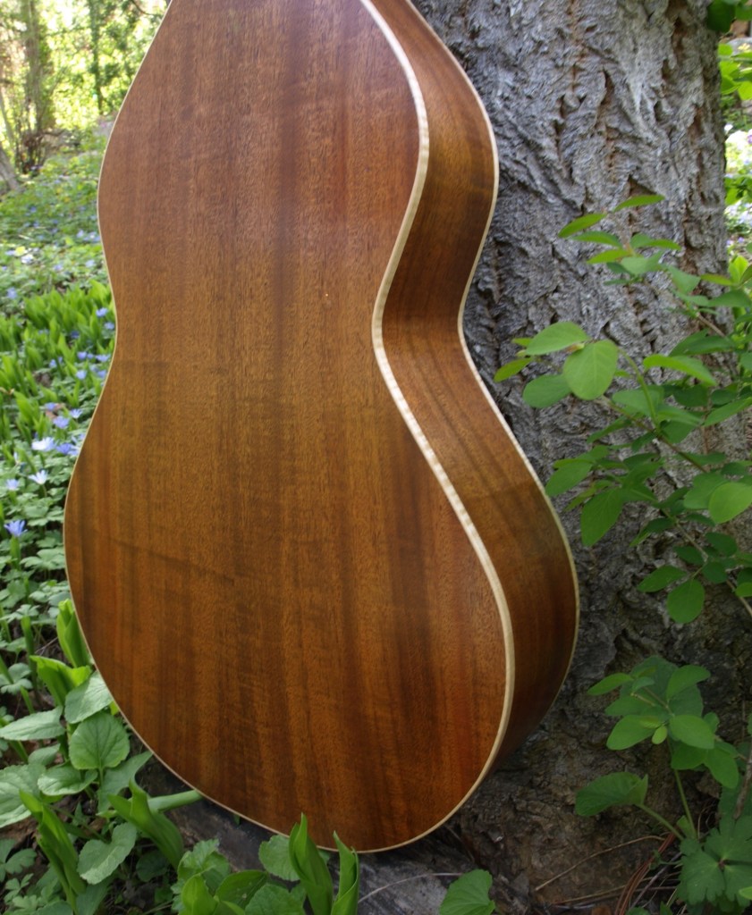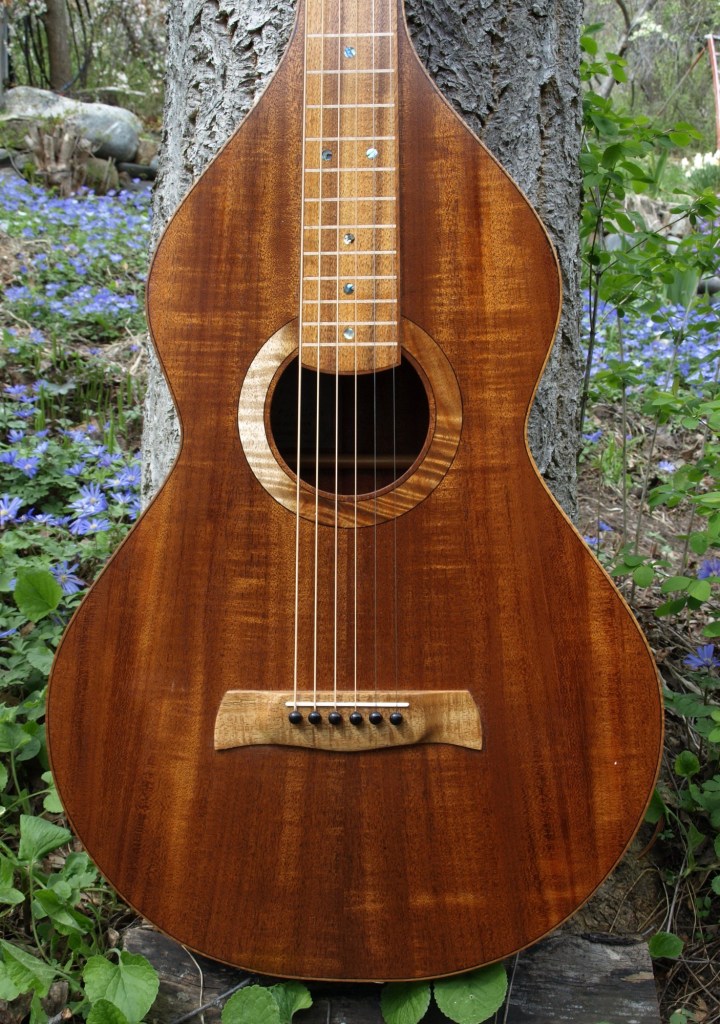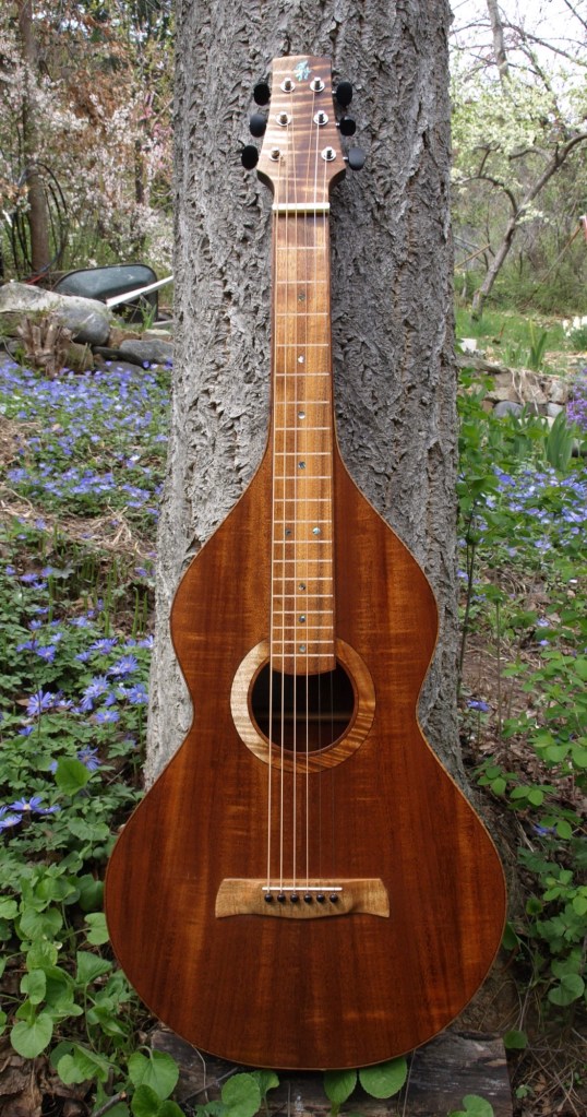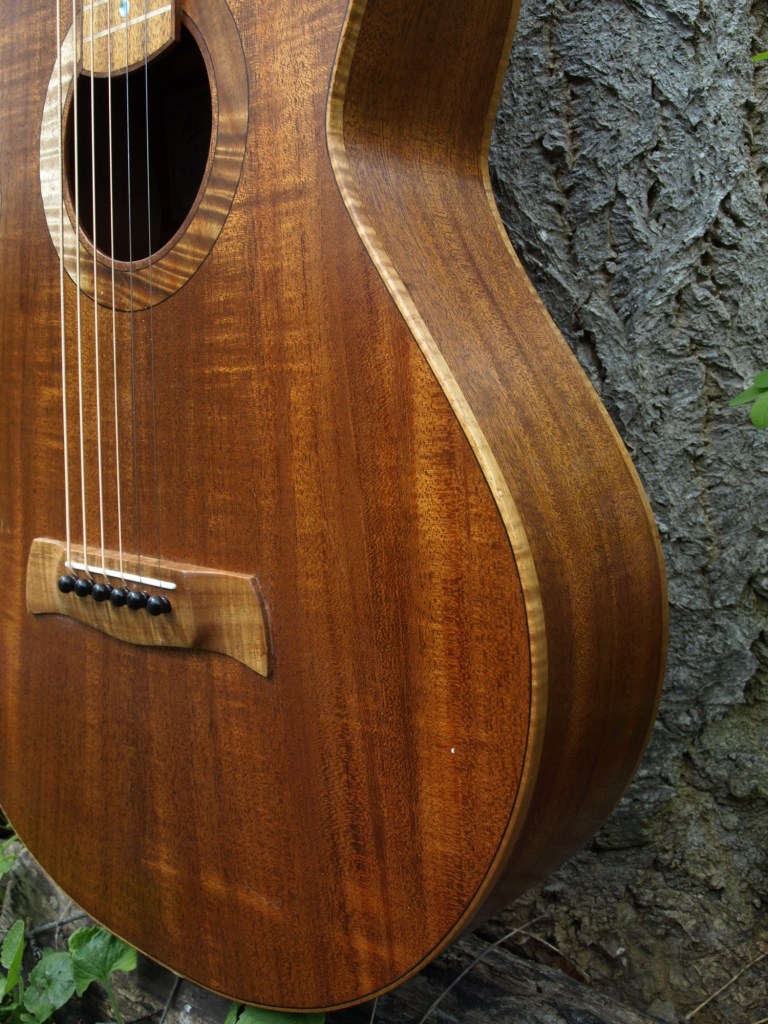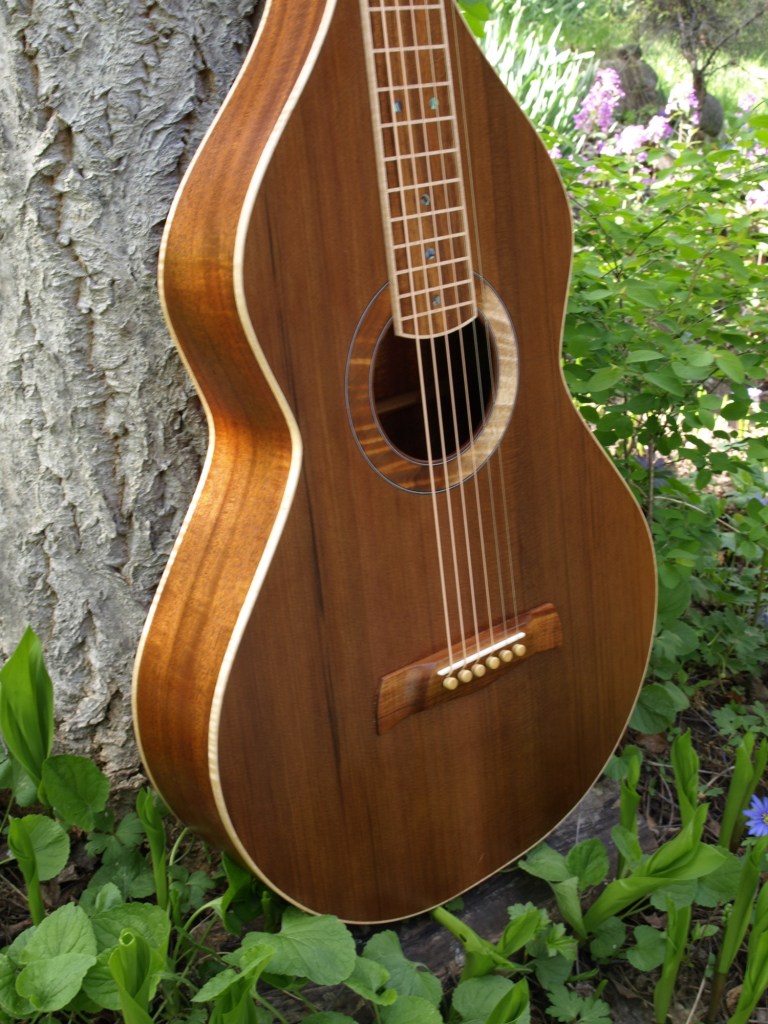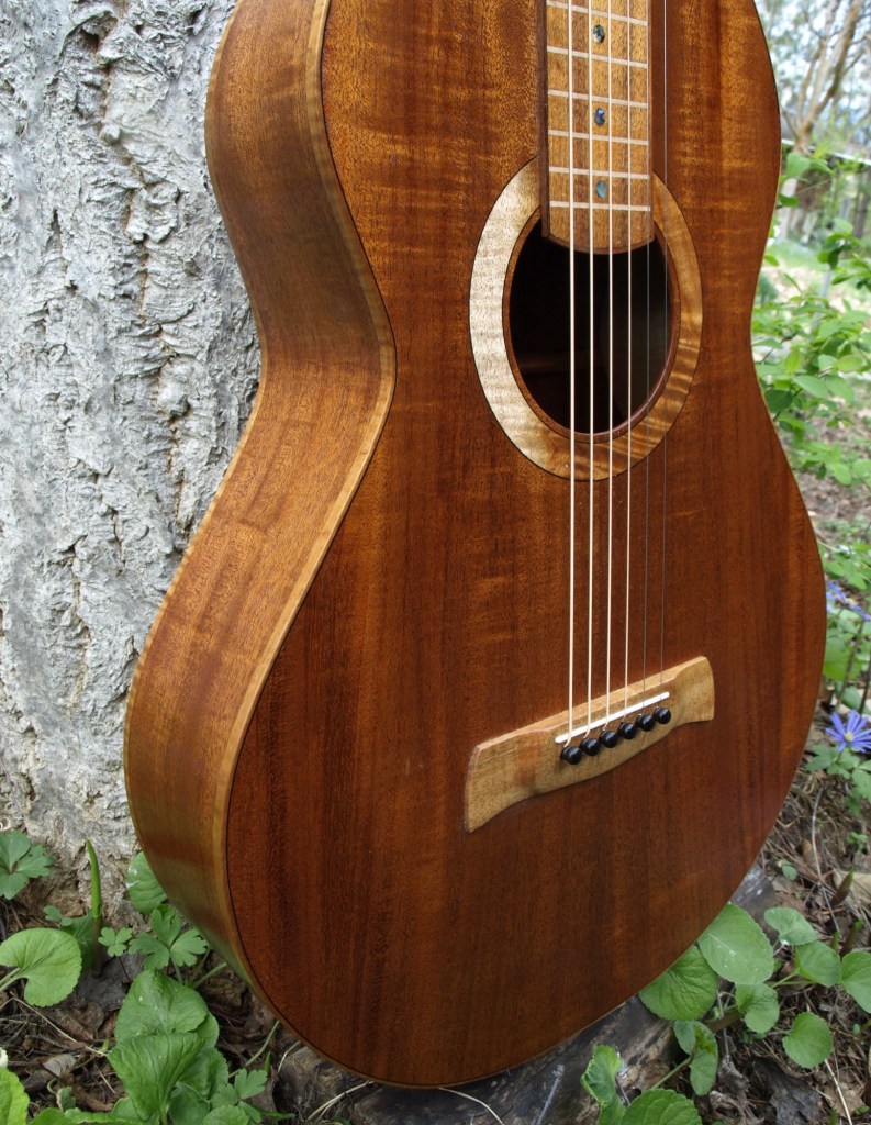 #26, Honduran Mahogany back, sides and top. Laminated sides. Koa bridge, fretboard, rosette, binding and headstock veneer. 25″ scale, with abalone fret markers @ 3,5,7,9,12,15,17 &19th frets. Spruce bracing, Gotah tuners with ebony buttons, and a K&K Pure Mini pickup.