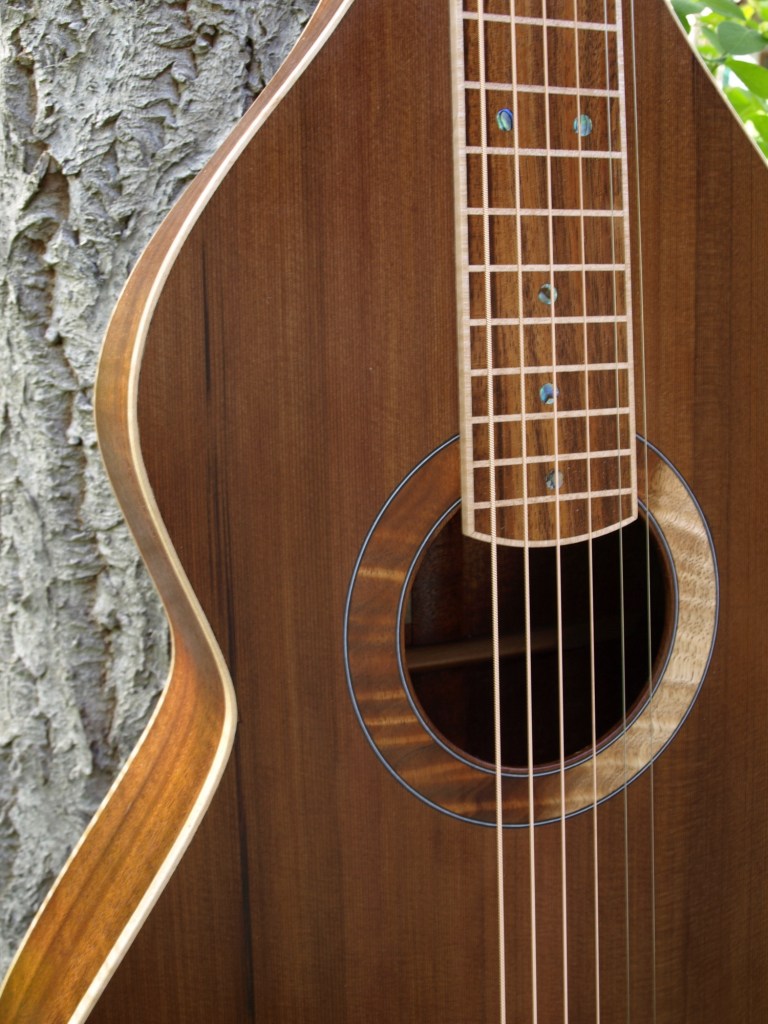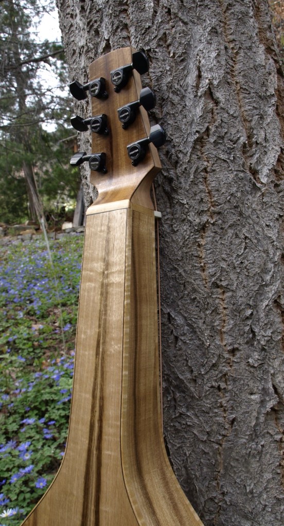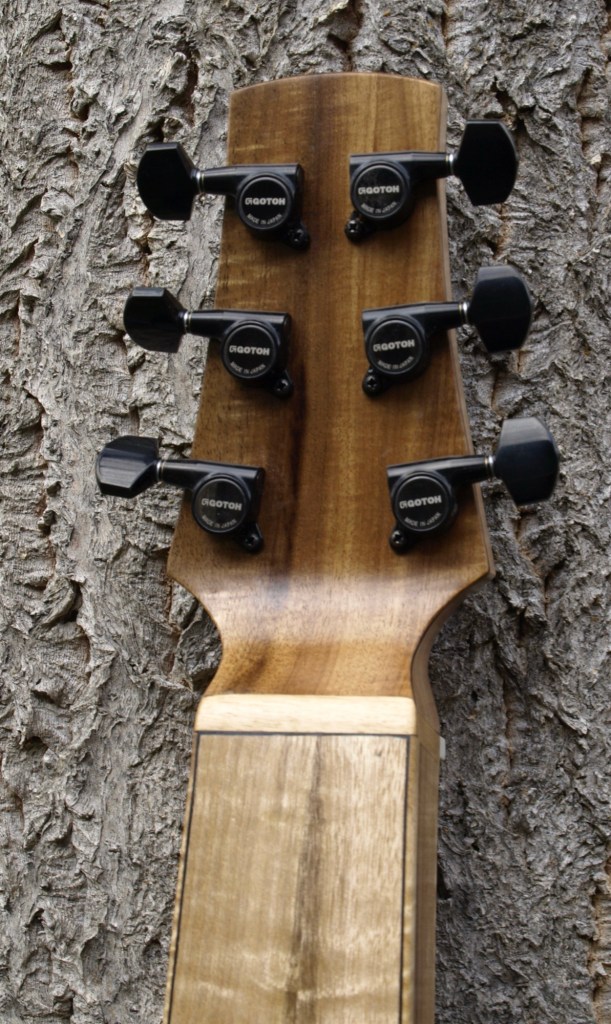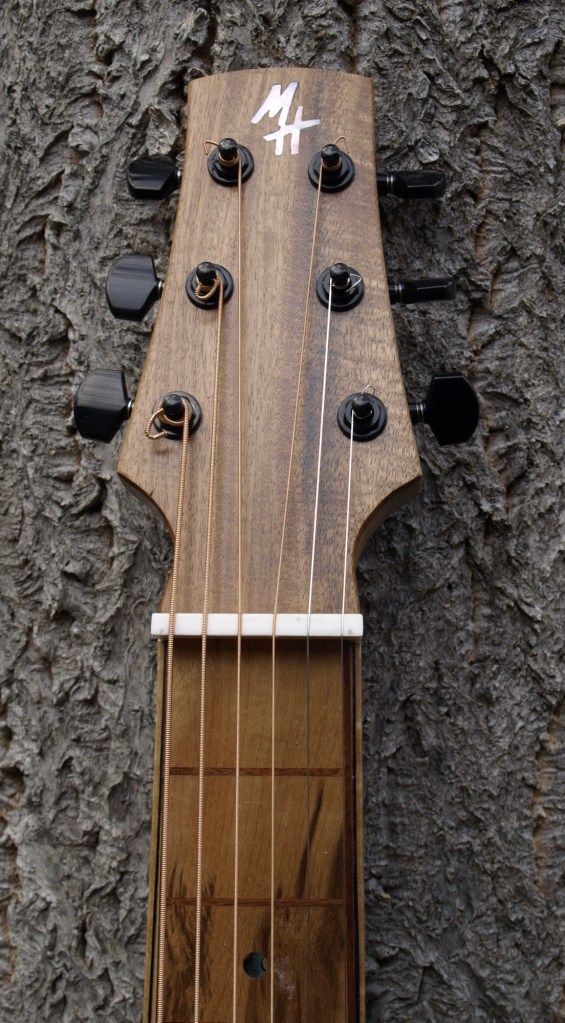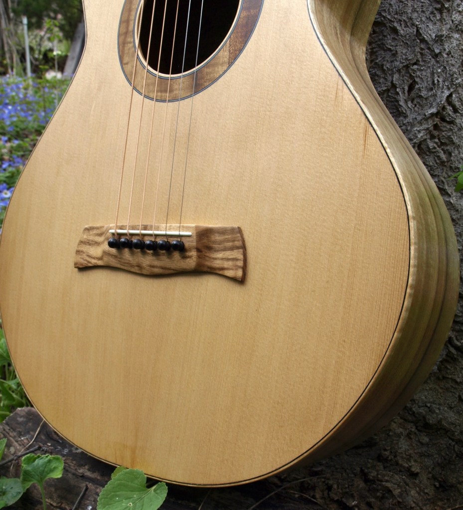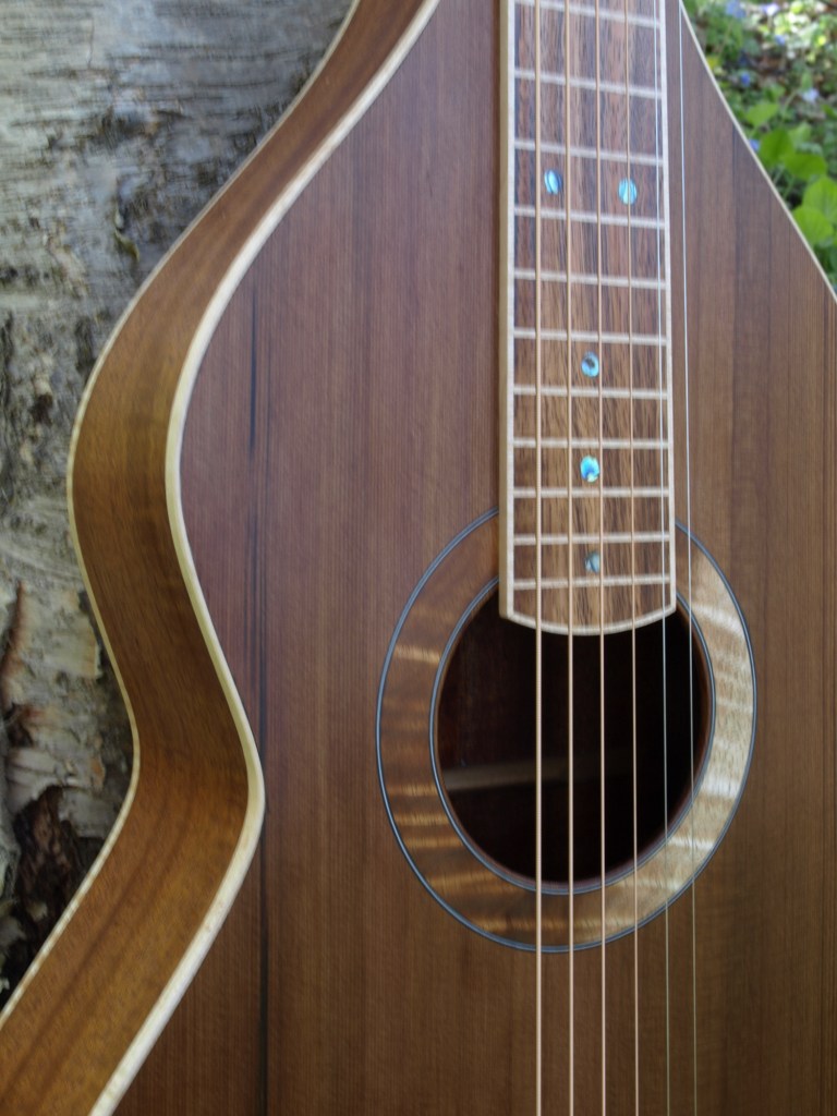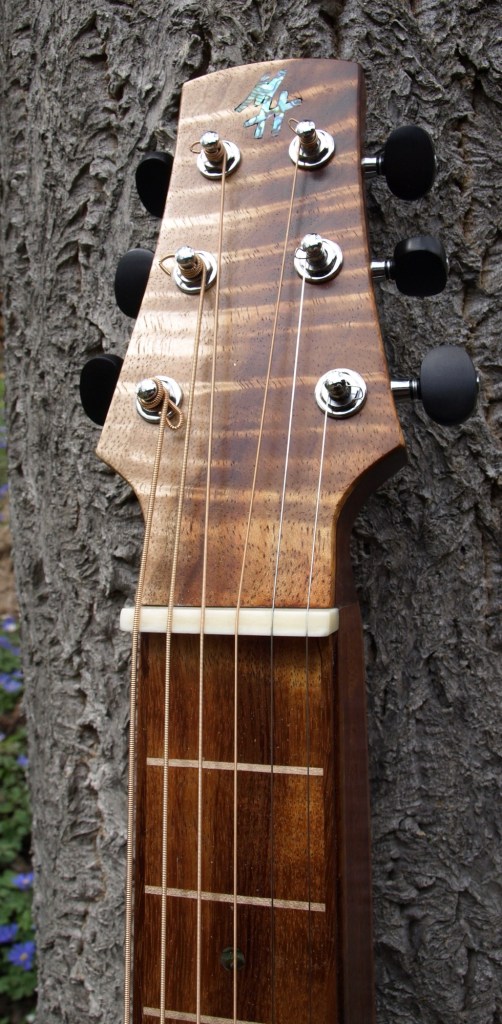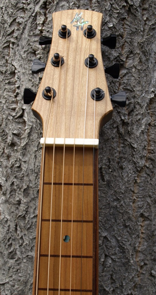 #28 – Myrtle wood back & sides, also laminated sides, and a Port Orford Cedar top. The bridge, fretboard, rosette, headstock veneer and binding are myrtle. Both woods that are endemic to the southern Oregon coast, both beautiful woods and trees, and excellent tonewoods. Spruce bracing, bone nut & saddle, and a K&K pure Mini under bridge pickup. Gotah tuners with ebony tuners. 25″ scale.