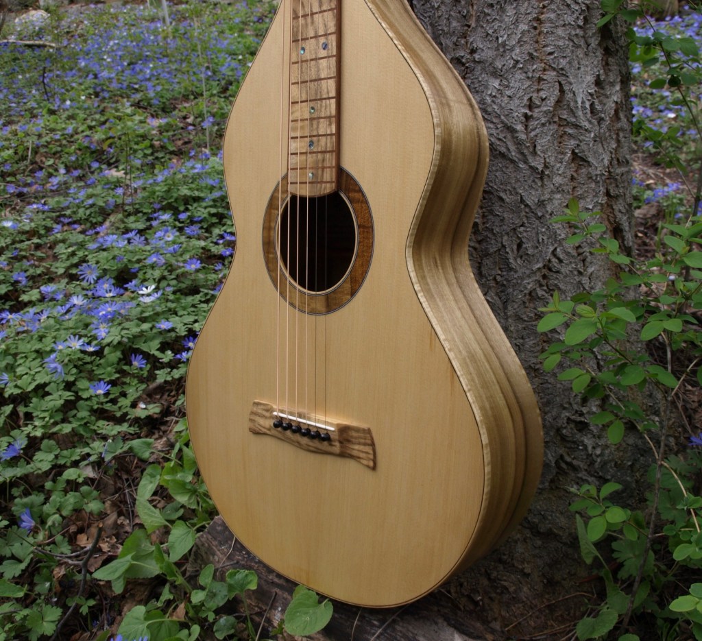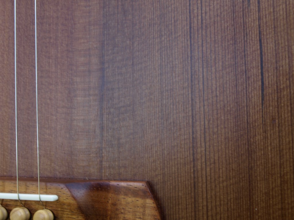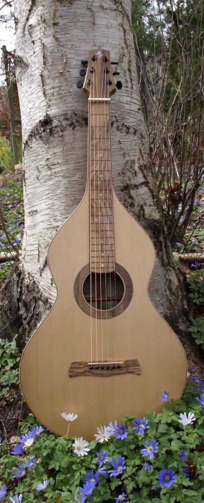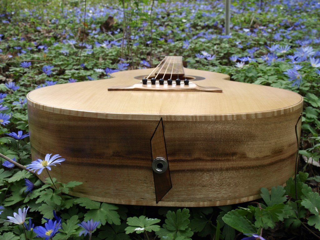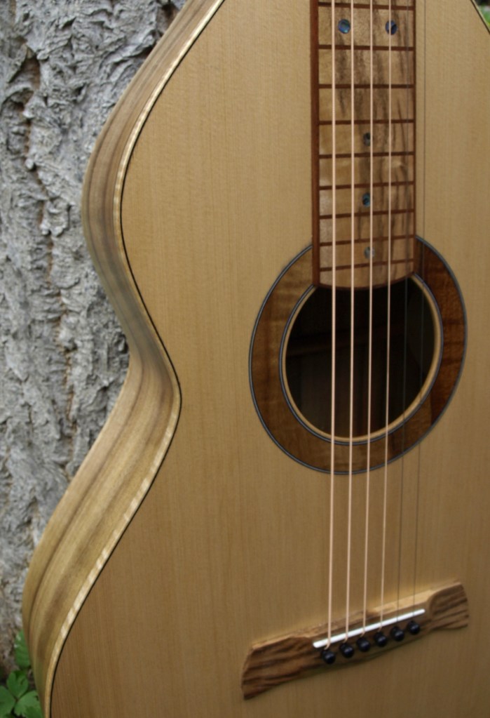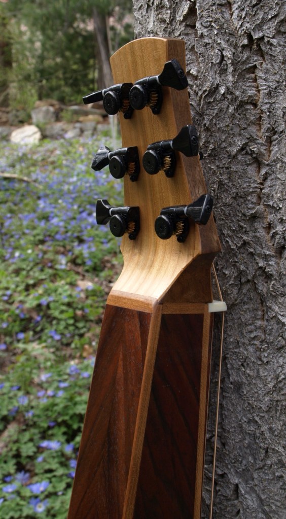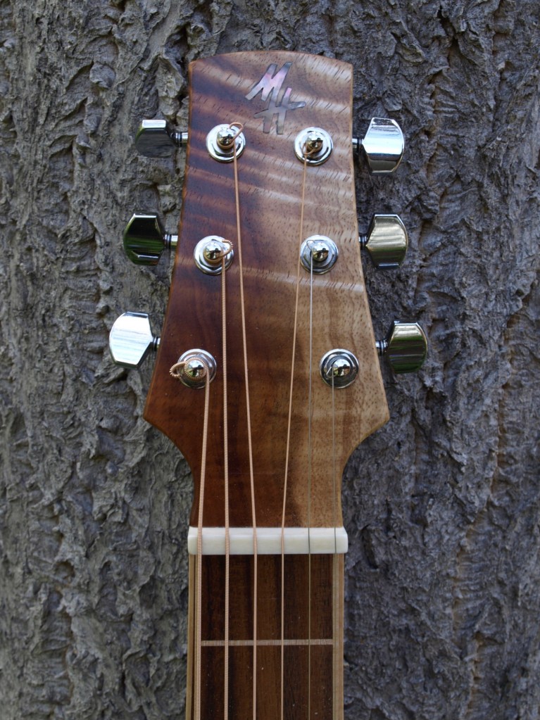 #28 – Myrtle wood back & sides, also laminated sides, and a Port Orford Cedar top. The bridge, fretboard, rosette, headstock veneer and binding are myrtle. Both woods that are endemic to the southern Oregon coast, both beautiful woods and trees, and excellent tonewoods. Spruce bracing, bone nut & saddle, and a K&K pure Mini under bridge pickup. Gotah tuners with ebony tuners. 25″ scale.