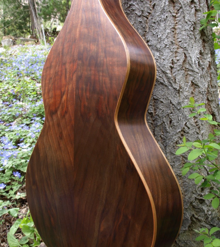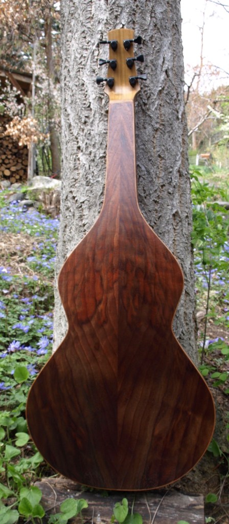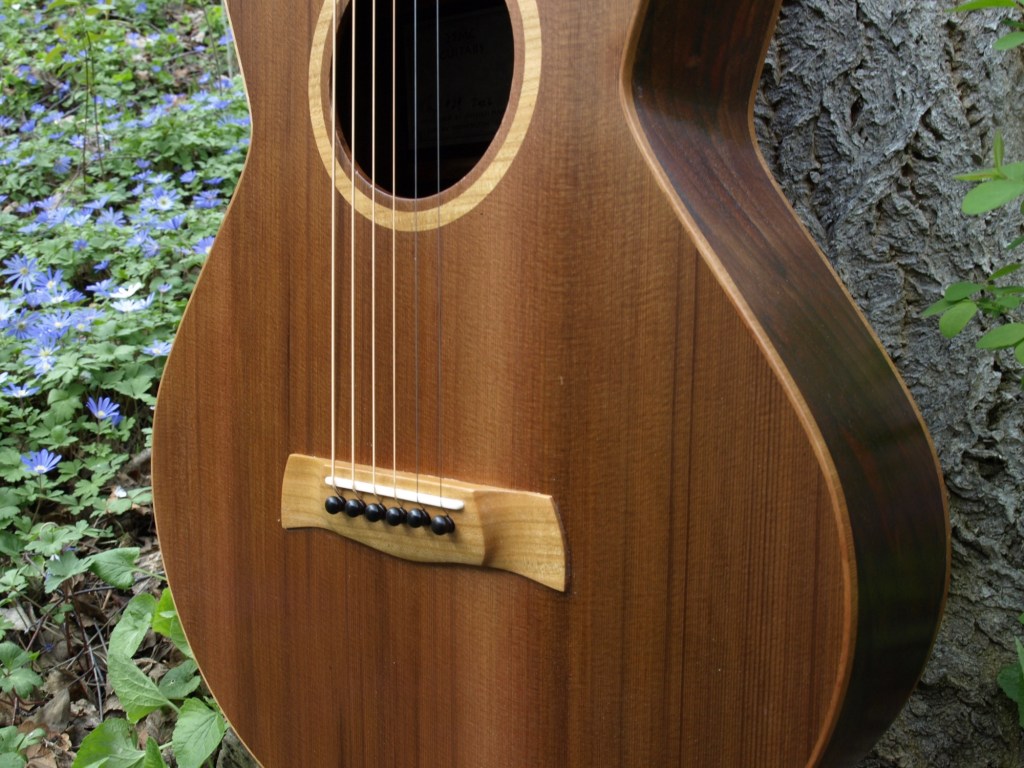 #29 – Black walnut back and sides, a one piece old growth Western red cedar top. Cherry bridge, fretboard, rosette, binding and headstock veneer. Spruce bracing, laminated sides, bone nut & saddle, K&K Pure Mini pickup, Hipshot locking tuners. 25″ scale.