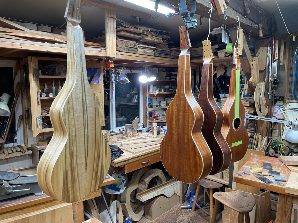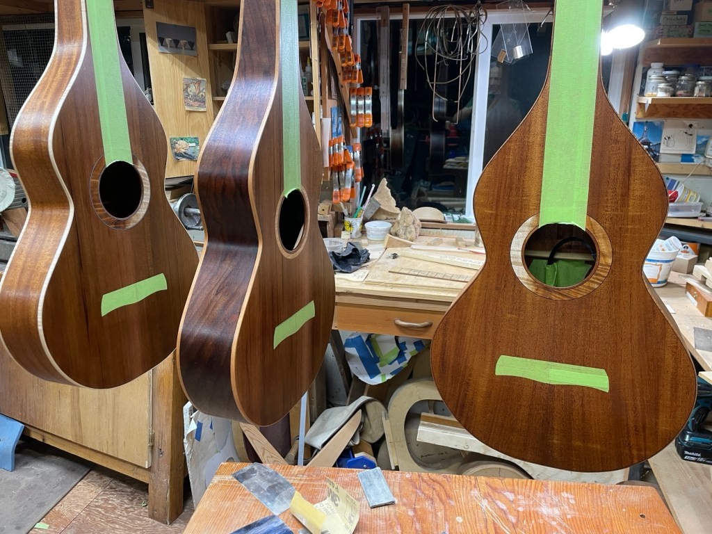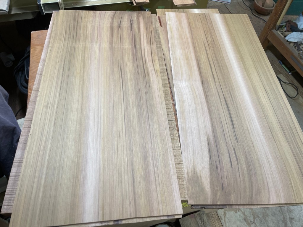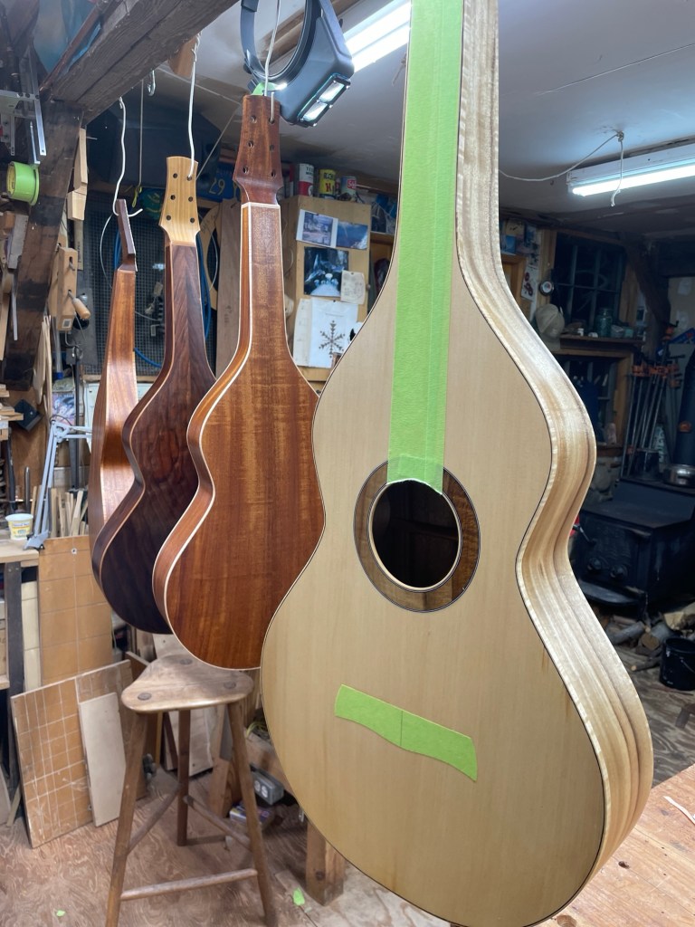 My Winter projects have been four Hawaiian steel guitars, or Weissenborns as they are commonly known as. Two are made with the Honduran Mahogany mentioned in my previous post, one of those with a mahogany top, the other with a red cedar top. One is made from myrtlewood and Port Orford cedar top and the fourth is black walnut with a red cedar top. They all have laminated sides, the sides with 1/4″ thick kerfed red cedar and then a 1/16″ veneer on the inside, I did a post about all this last year.