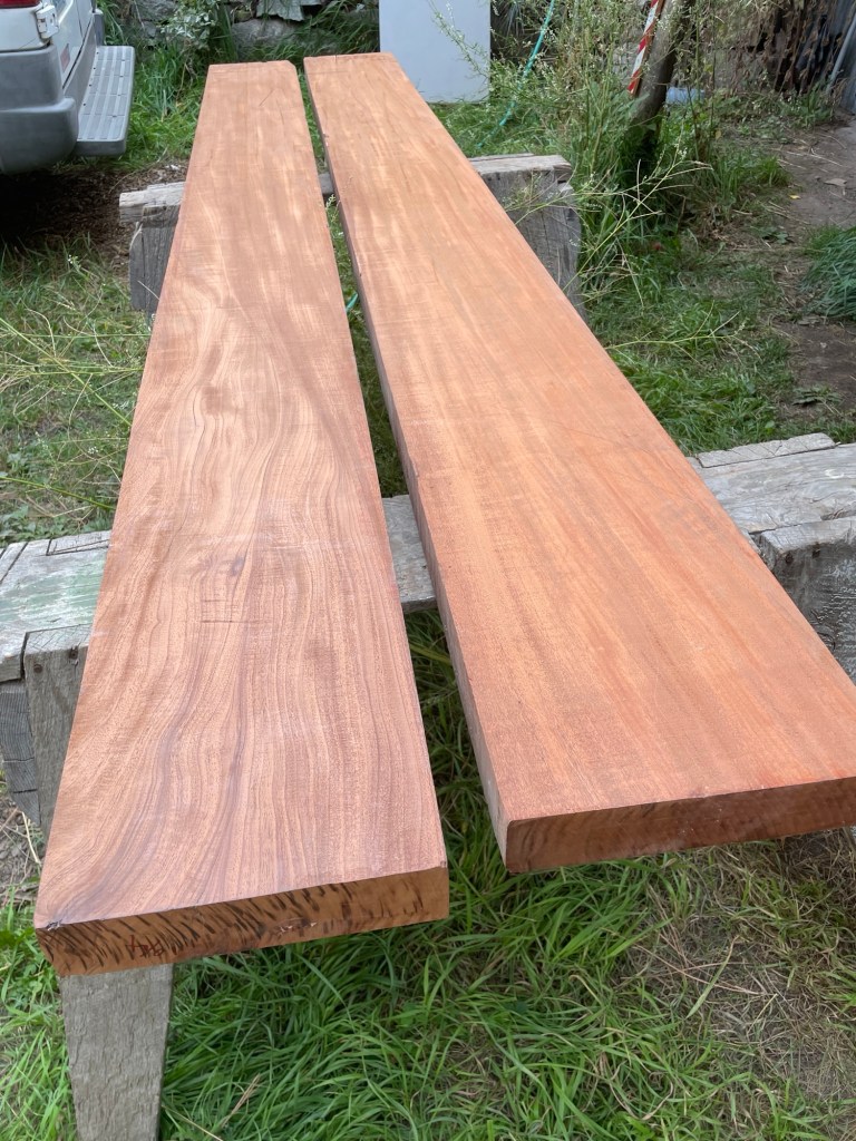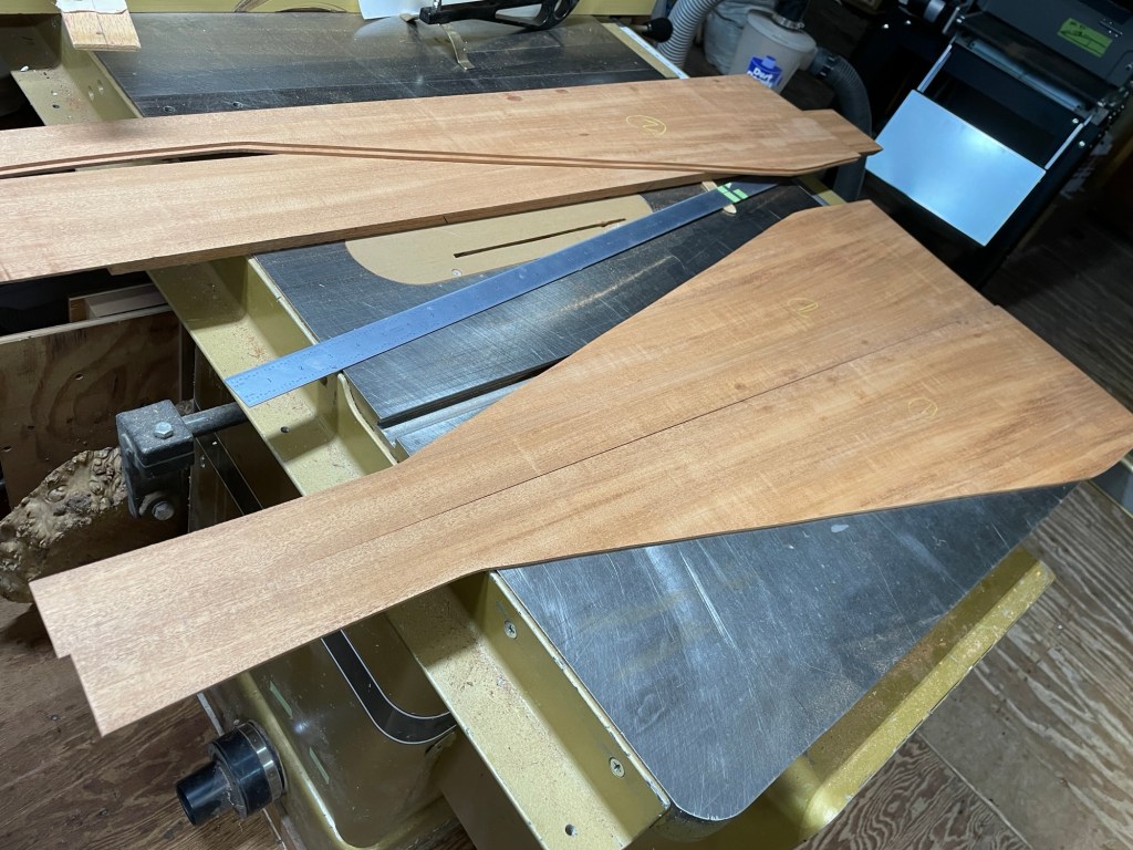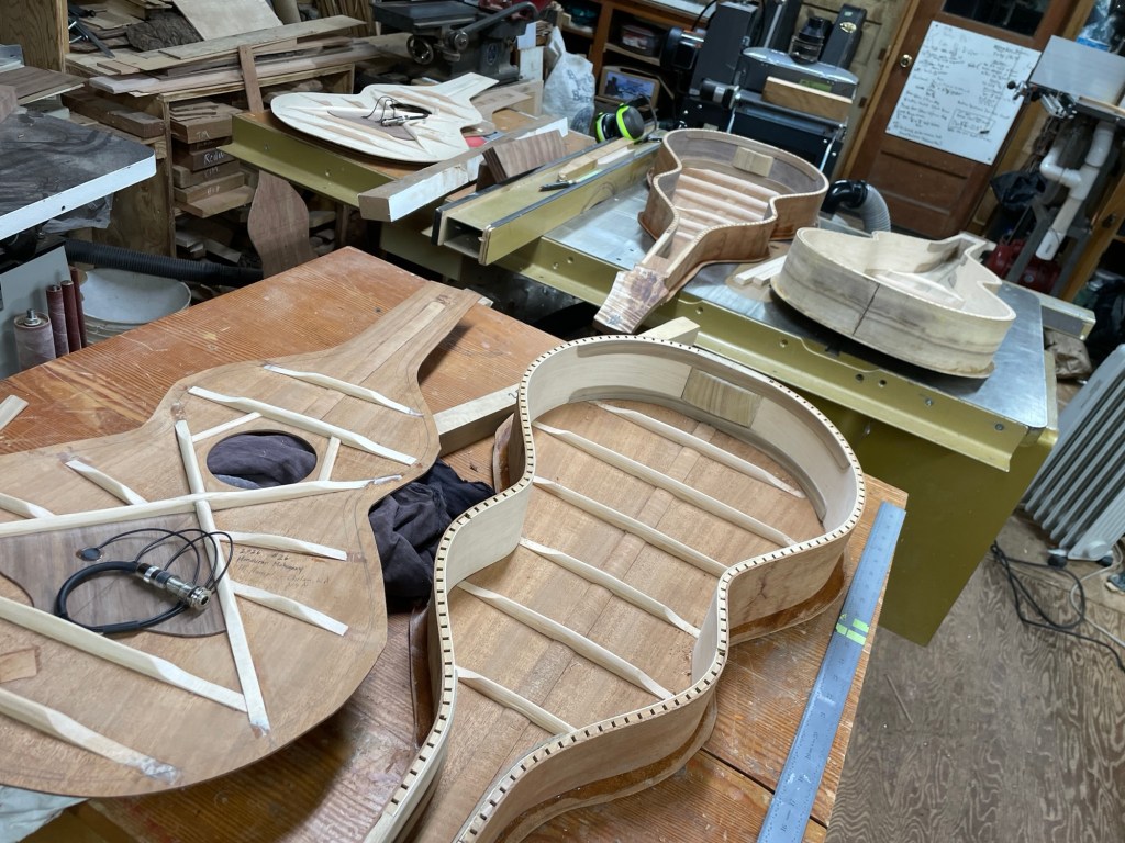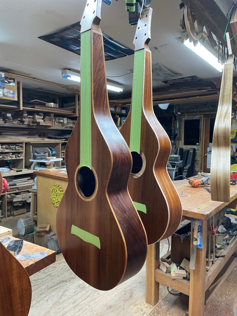My Winter projects have been four Hawaiian steel guitars, or Weissenborns as they are commonly known as. Two are made with the Honduran Mahogany mentioned in my previous post, one of those with a mahogany top, the other with a red cedar top. One is made from myrtlewood and Port Orford cedar top and the fourth is black walnut with a red cedar top. They all have laminated sides, the sides with 1/4″ thick kerfed red cedar and then a 1/16″ veneer on the inside, I did a post about all this last year.